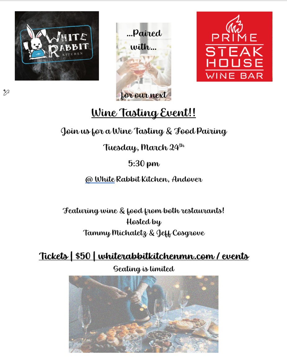 at White Rabbit Kitchen in partnership with our friends at Prime, Blaine!! Featuring Wine & Food from both restaurants... Tickets $50
